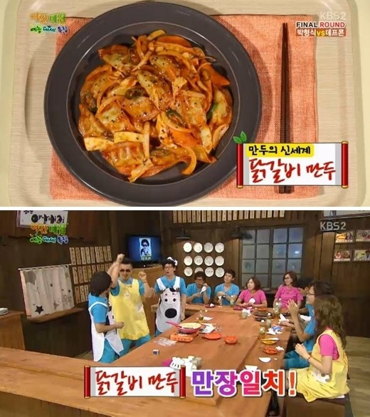 데프콘의 닭갈비 만두를 맛본 MC진과 게스트들은 “상상하지 못한 조합의 맛이다”, “내 스타일이다”, “너무 맛있다”고 극찬했다. 데프콘은 요즘 ‘아기 병사’로 화제를 모으고 있는 그룹 제국의 아이들의 박형식이 선보인 ‘형식이 밥’을 1표차로 따돌렸다.