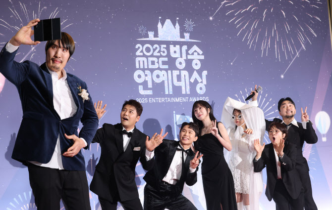 '전지적 참견 시점' 최홍만(왼쪽부터)과 전현무, 양세형, 쯔양, 홍현희, 송은이 유병재가 29일 오후 서울 마포구 MBC 미디어센터 공개홀에서 열린 '2025 MBC 방송연예대상' 레드카펫 행사에 참석해 포즈를 취하고 있다.(사진=뉴스1)