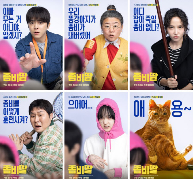올여름 극장가를 사로잡을 영화 ‘좀비딸’이 5인 1묘 캐릭터 포스터와 캐릭터 예고편을 전격 공개했다. ‘좀비딸’은 이 세상 마지막 남은 좀비가 된 딸을 지키기 위해 극비 훈련에 돌입한 딸바보 아빠의 코믹 드라마.