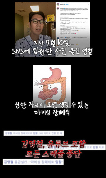 김영철은 이어 “마비성 장폐색으로 대장 또는 소장이 일시적으로 마비되는 상태였다. 매운 음식을 너무 과하게 먹었나봐”라고 말했다.