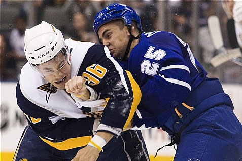[이데일리 SPN 김상화기자] 23일(이하 한국시간) 캐나다 토론토에서 열린 북미하키리그(NHL) 토론토와 버팔로의 시범 경기에서 패트릭 칼레타(버팔로, 오른쪽)와 벤 온드루스(토론토)가 주먹다짐을 벌이고 있다.