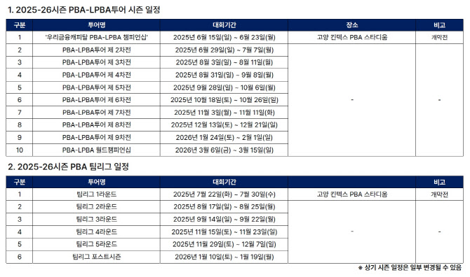한편, PBA는 오는 11일 2시30분부터 서울 중구 프레스센터에서 ‘2025~26시즌 PBA-LPBA투어 개막 미디어데이’를 진행한다. 이 자리에는 프로당구를 대표하는 선수들이 참석해 새 시즌에 대한 각오와 목표를 밝힌다.