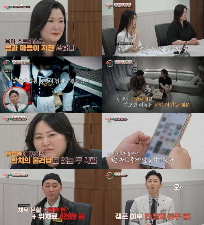 MC들은 13기 첫 번째 부부의 일상을 담은 영상을 살펴보며 다양한 충고와 의견을 전했다. 영상에서는 육아에 지쳐 짜증이 커지고, 다단계와 사기 피해를 입은 아내의 모습이 드러났다. 또 가정 경제가 어려워진 상황에서 자녀의 돌반지까지 없어지며 남편의 신고로 과학수사대까지 출동했던 사실이 밝혀졌다.