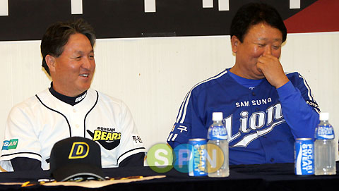 [이데일리 SPN 한대욱기자]15일 오후 서울잠실야구장에서 열린 2008 프로야구 플레이오프 미디어데이에서 두산 김경문 감독(왼쪽)과 삼성 선동열 감독이 밝게 웃고 있다.