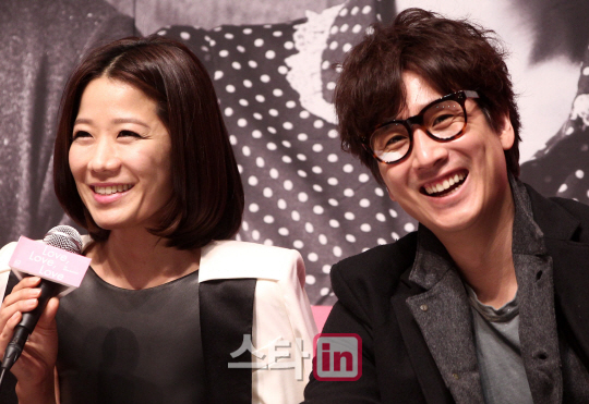 [이데일리 스타in 권욱 기자] 배우 전혜진(왼쪽)과 이선균 부부가 5일 서울 명동예술극장에서 열린 연극 '러브, 러브, 러브'(연출 이상우) 기자간담회에서 밝게 웃고 있다.