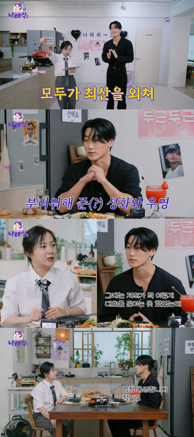 산은 “멤버들이 ‘나래식’에 나간다니까 엄청 부러워했다”며 “예전 ‘놀토’ 촬영 때 선배님과 대화를 많이 못 했다. 그래서 되게 뵙고 싶었다. 선배님을 정말 동경한다”고 말해 훈훈함을 자아낸다. 이에 박나래는 산의 본명인 ‘최산’으로 센스 넘치는 이행시를 지어 산을 흡족하게 한다.