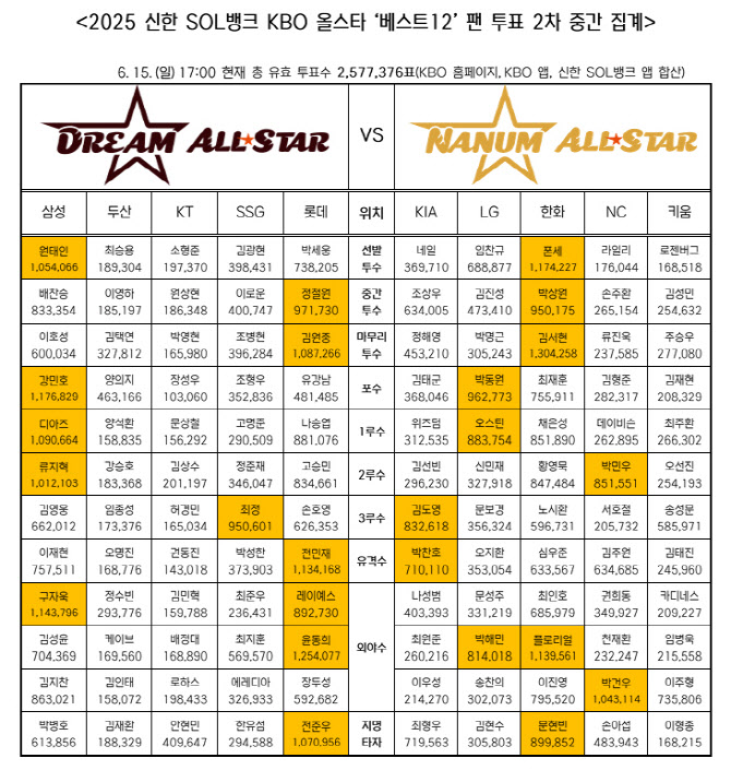지난 2024 시즌에 이어 역대 2번째 전반기 600만 관중 돌파를 앞두고 있는 KBO 리그의 열기는 올스타 팬 투표에도 그대로 전해진다. 2차 중간 집계 결과 총 투표수 257만7376표로, 2024 올스타전 2차 중간 집계 때의 234만1719표 보다 약 10% 증가했다.
