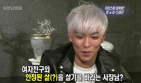 지드래곤과 탑은 "크리스마스를 같이 보낼 여자 친구가 있느냐"는 질문에 나란히 "없다"고 답했다. 이어 "사장님의 눈치를 본 대답이 아니냐"는 질문이 이어지자 "사장님은 오히려 여자 친구와 안정된 삶을 살길 바란다"고 대답해 웃음을 자아냈다.