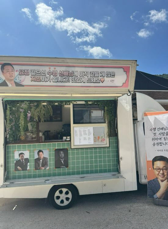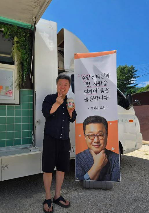 공개된 사진 속에는 아이유가 박수영에게 보낸 커피차가 담겨있다. 아이유는 커피차에 ‘요정 같으신 수영 선배님께 아직 갚을 게 많은 지안이가 쏩니다! 맛있게 드세요. -지안’이라는 응원을 남겼다.