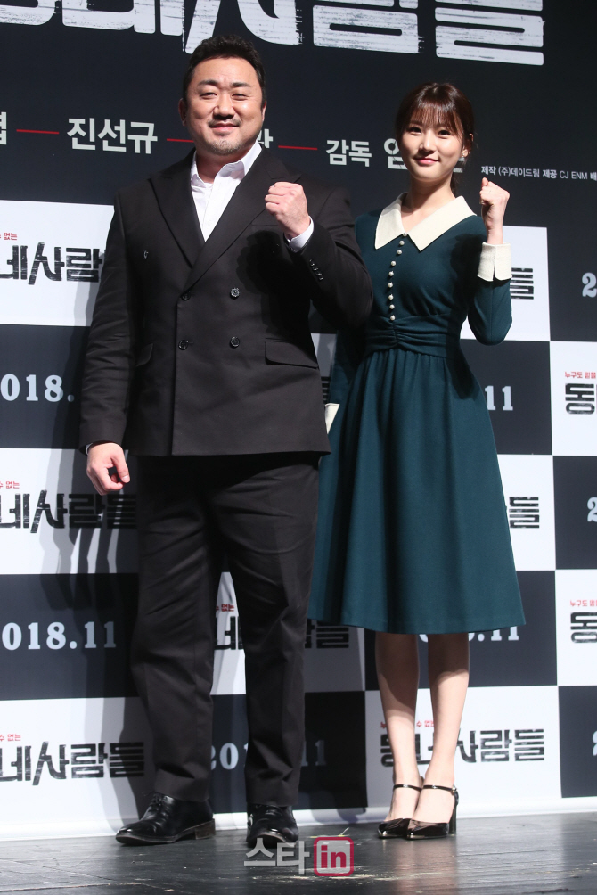 [이데일리 스타in 노진환 기자] 배우 마동석과 김새론이 8일 오전 서울 압구정CGV에서 열린 영화 ‘동네사람들’ 제작발표회에 참석해 포즈를 취하고 있다.
