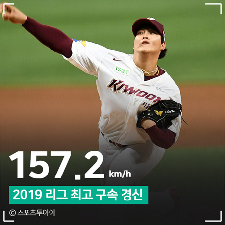 조상우는 지난 2일 문학 SK전에서 제이미 로맥을 상대로 시속 157.2km의 직구를 던진 것으로 나타났다. 볼로 판정됐지만, 지난달 13일 한화 정은원과의 맞대결에서 기록한 156.9km 직구를 넘어 올 시즌 리그 최고 구속 기록을 갈아치웠다.