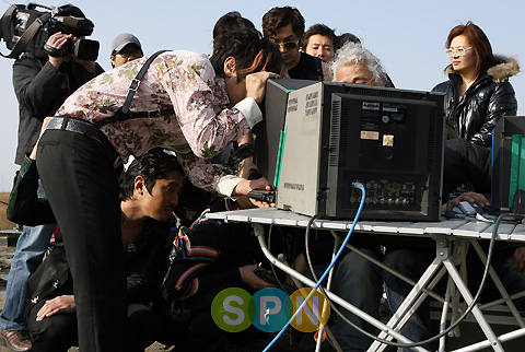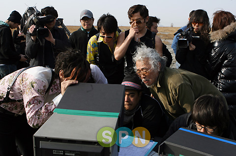 [이데일리 SPN 김정욱기자] 19일 오후 경기도 화성시 음섬주변벌판에서 그룹 신화의 9집 뮤직비디오 촬영 현장이 공개됐다. 멤버들이 촬영을 마치고 모두 모여 모니터링을 하고 있다.