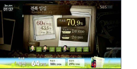 SBS 대선 개표 방송 ‘2012 국민의 선택’은 타 방송사보다 1시간 빠른 19일 오후 3시부터 시작됐다. 그만큼 발 빨랐고 준비도 착실했다. 특히 CG(컴퓨터 그래픽)은 높은 퀄러티로 시청자의 칭찬을 고루 받았다.