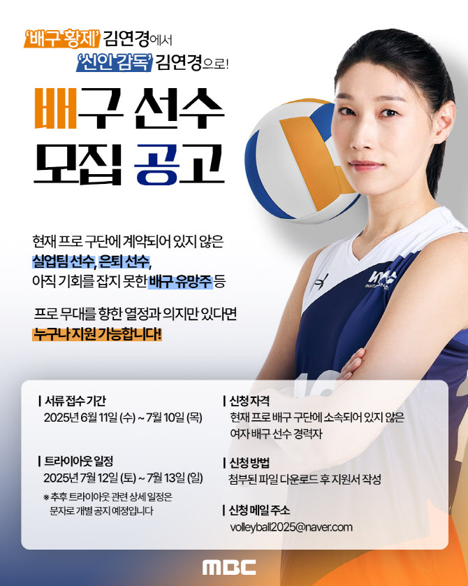 프로 배구 구단에 소속되어 있지 않은 여자배구 선수 경력자가 신청 가능하며 공고에 기재된 메일 주소를 통해 신청할 수 있다. 서류 접수 기간은 11일부터 오는 7월 10일까지다.