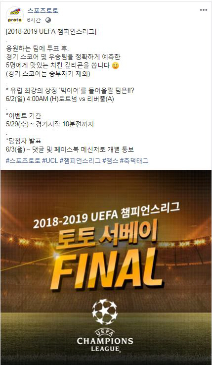 이번 이벤트 관련 자세한 사항은 스포츠토토 페이스북에서 확인할 수 있으며, 당첨자는 오는 6월 3일 페이스북 메신저 및 댓글로 개별 통보할 예정이다.