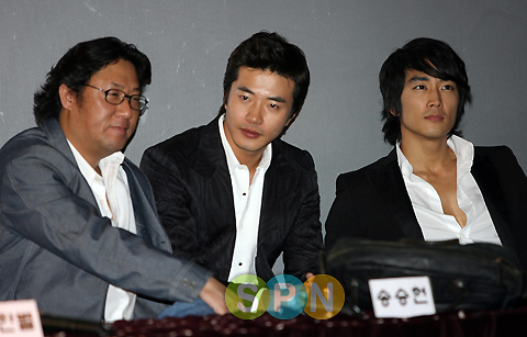 시사가 끝난 후 열린 기자간담회에서 김해곤 감독과 주연배우 송승헌 권상우가 포토타임을 기다리고 있다.