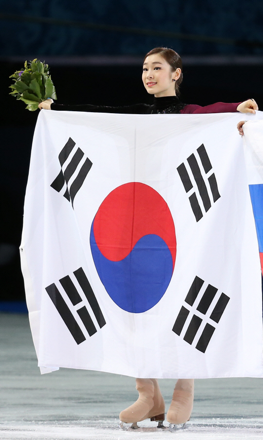 (소치=연합뉴스) 제22회 러시아 소치 동계올림픽에 출전한 '피겨 여왕' 김연아(왼쪽 시상대 위)가 21일 오전(한국시간) 소치 아이스버그 스케이팅 팰리스에서 열린 여자 피겨스케이팅 싱글 프리 스케이팅 경기에서 은메달을 차지한 뒤 플라워 세리머니를 마치고 태극기를 들고 기념촬영을 하고 있다.