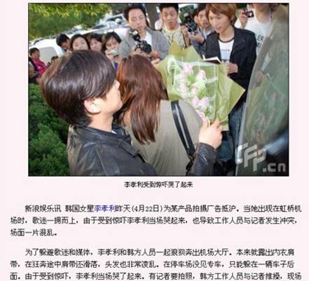 중국의 포털사이트 시나닷컴은 지난 23일 "중국 상하이 홍차이 국제공항에 도착한 이효리를 팬들이 갑작스럽게 에워싸 이효리가 놀란 나머지 울음을 터뜨렸다"며 "관계자와 기자 사이에도 충돌이 발생해 일대 혼란을 빚었다"고 보도했다.
