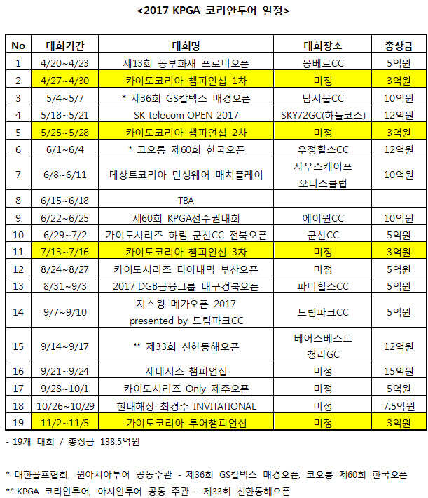 2017 KPGA 코리안투어는 총 19개 대회와 총상금 138억5000만원원의 규모로 치러지게 된다. 19개 대회 개최는 2008년 20개 대회를 개최한 이래 역대 두 번째로 많은 대회수다. 총상금은 지난 2011년 132억원을 뛰어넘는 역대 최고 규모다.