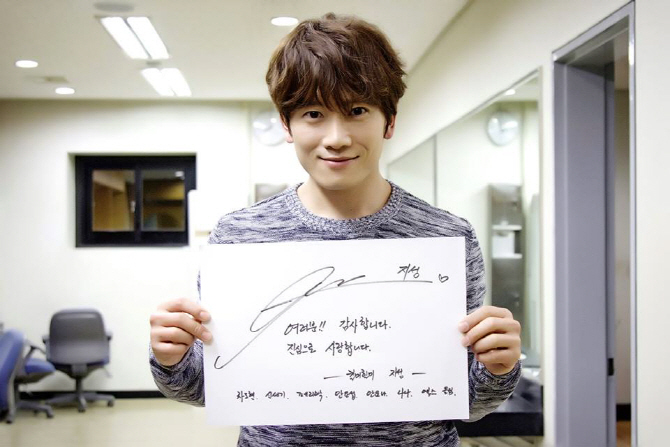 지성은 13일 오후 사인과 함께 감사 인사를 담아 환한 미소로 카메라 앞에 섰다. 지성이 든 종이에는 ‘킬미힐미’ 캐릭터인 차도형 신세기 안요나 나나 등 7가지 이름이 적혀 있어 눈길을 끈다.