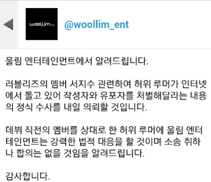 이어 “데뷔 직전의 멤버를 상대로 한 허위 루머에 강력한 법적 대응을 할 것이며 소송취하나 합의는 없을 것”이라며 강경한 입장을 보였다.