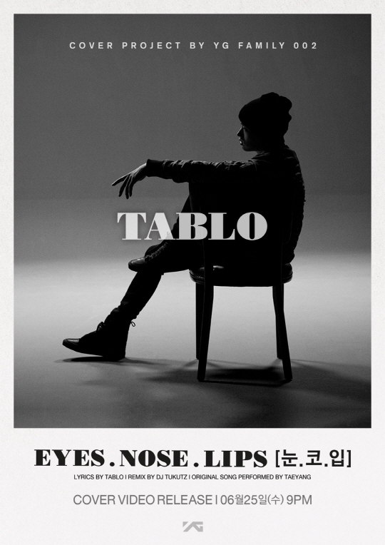 YG엔터테인먼트(이하 YG) 는 24일 오후 4시YG공식블로그(www.yg-life.com)에 타블로의 ‘눈,코,입’ 커버 예고 이미지를 게재했다. 흑백의 티저 이미지는 타블로가 의자에 홀로 앉아 고독한 느낌의 포즈를 취한 모습을 담고 있다.