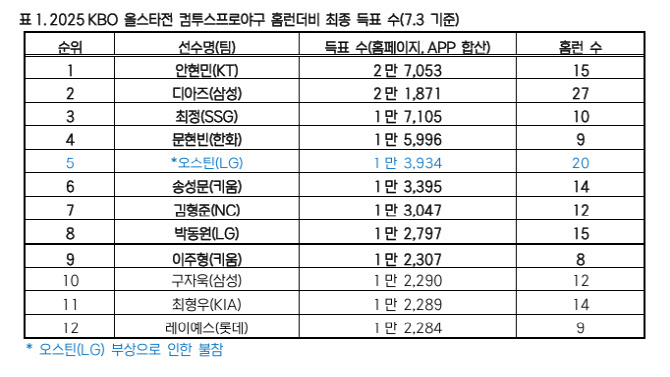 LG 오스틴은 1만 3934표를 얻어 팬 투표 5위에 올랐으나 부상으로 올스타전 출전이 불발됐다. 오스틴의 자리는 차순위 득표 선수인 이주형(키움·1만 2307표)이 대신한다.