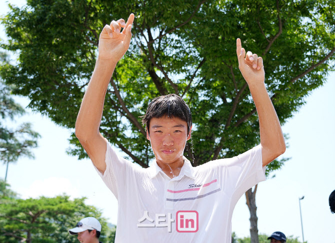 아마추어 중등부 손제이가 1위 확정 후 물세례를 받고 있다.