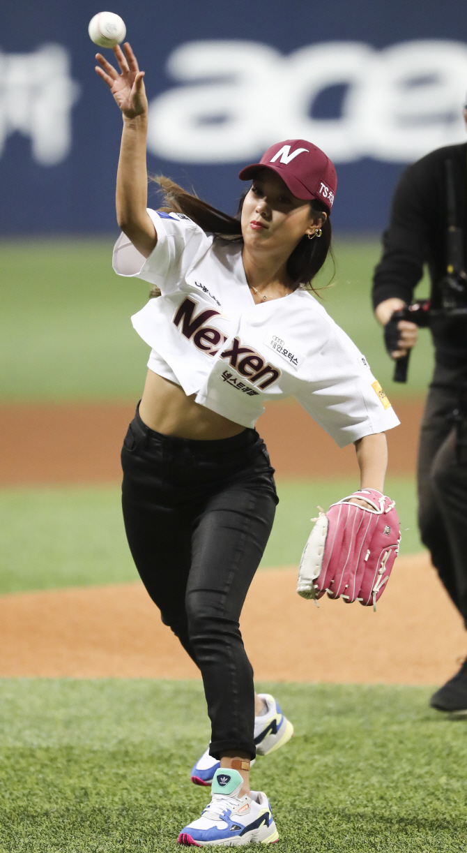 (서울=연합뉴스) 23일 오후 서울 고척스카이돔에서 열린 2018 KBO 포스트시즌 한화 대 넥센 경기. 배우 김희정이 시구를 하고 있다.