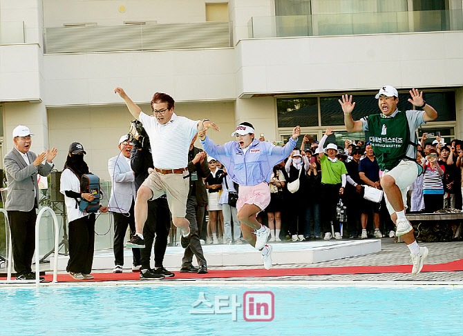 [골프in포토] 노승희, 아빠 캐디와빠와 함께 수영장 입수 세레머니