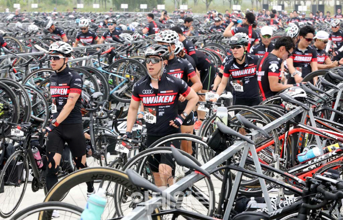 [이데일리 김태형 기자] 스포츠 브랜드 데상트가 17일 인천 송도 달빛축제공원에서 개최한 '2018 듀애슬론 레이스'대회 참가자들이 러닝을 마치고 바꿈터에서 사이클코스로 전환하고 있다.
