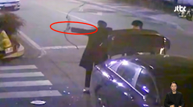 CCTV 영상에는 광장 옆 도로 갓길에 주차된 차량 뒤로 남성 2명의 모습이 보인다. 이 중 야구점퍼를 입은 남성이 차 트렁크에서 활을 꺼냈고, 함께 있던 남성이 시위를 당겼다 놨다 여러 번 시도하더니 화살이 날아갔다.