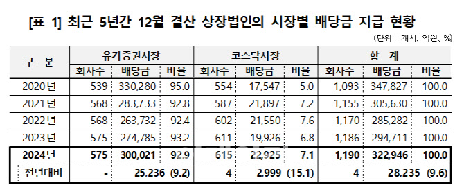 코스피 상장사의 현금배당 규모는 30조21억원으로 전년보다 9.2% 늘었다. 코스닥 시장에선 15.1% 증가한 2조2925억원의 배당금을 지급했다.