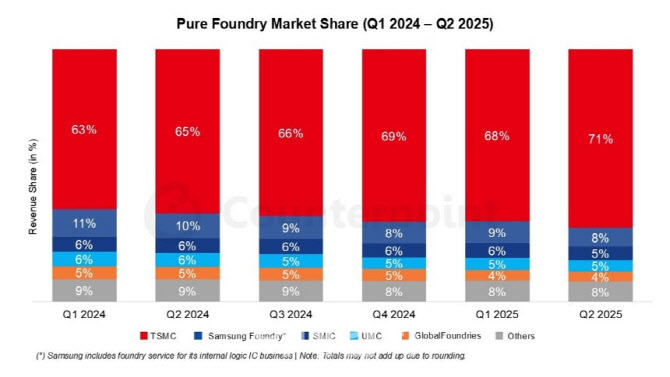 10일 시장조사업체 카운터포인트리서치에 따르면 TSMC는 올해 2분기 순수 파운드리 시장 점유율 71%로, 전 분기(68%) 대비 3%포인트 상승했다. 순수 파운드리 시장은 설계, 생산, 패키징 등 전체 파운드리 생태계 전반에서 파운드리 1.0에 속하는 반도체 위탁 생산 분야만을 의미한다.