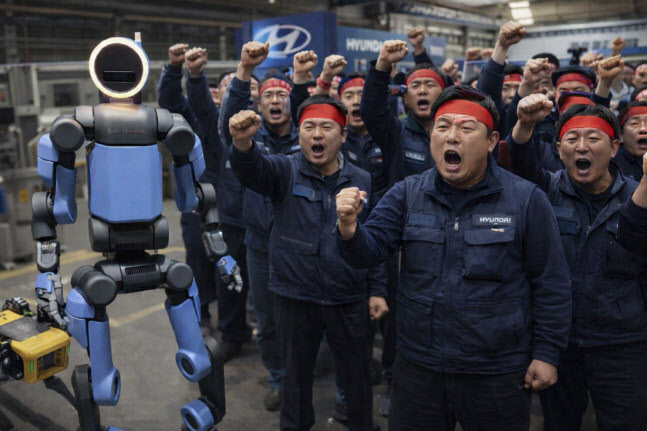 보스턴다이내믹스 차세대 로봇 ‘아틀라스’와 현대차 노조원 모습을 표현한 가상 이미지(출처=현대차, 챗GPT)