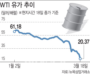 국제 기준인 브렌트원유는 18일 9% 하락한 배럴당 26.01달러를 기록해, 2003년 9월 26일 이래 최저 수준으로 떨어졌다. 미국 서부텍사스원유(WTI) 역시 배럴당 20.37달러로 24.4% 하락해 2002년 2월 이후 최저 수준을 기록했다. 역사상 세 번째 저점이다. 뱅크오브아메리카(BOA)는 “유가가 10달러대로 떨어질 수 있다”고 경고했다.