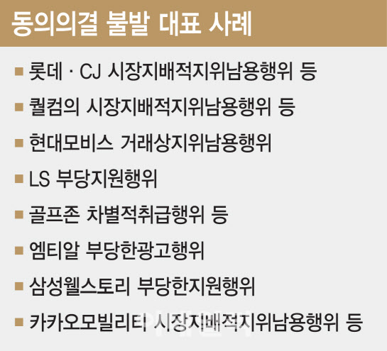 실제로 2011년 동의의결제도 도입 이후 지난해 말 기준 총 신청건수 28건 중 11건이 절차 개시 전 불발됐다. 담합 또는 고발 요건에 해당하는 중대 사건으로 판단됐기 때문이다. △2014년 12월 롯데·CJ 시장지배적지위남용행위 △2017년 11월 현대모비스 거래상지위남용행위 △2018년 7월 LS 부당지원행위 △2021년 6월 삼성웰스토리 부당지원행위 등이 대표적이다.
