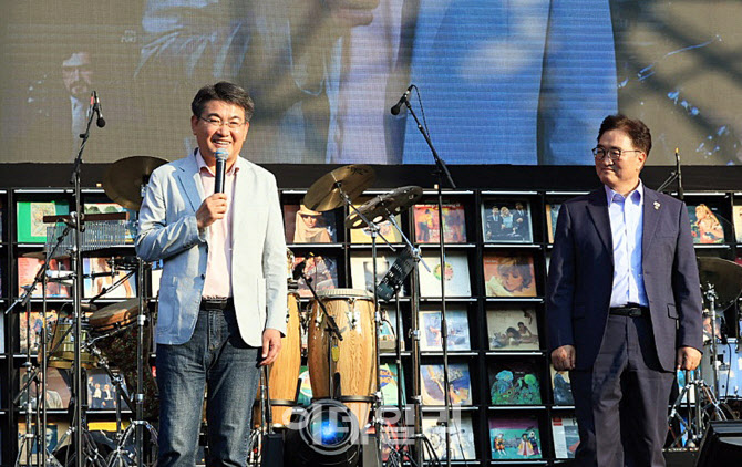 [이데일리 김태형 기자] 오승록(왼쪽) 노원구청장이 14일 수락산 스포츠타운 야구장에서 열린 ‘2025 수락산 선셋음악회’에 참석해 인사말을 하고 있다.