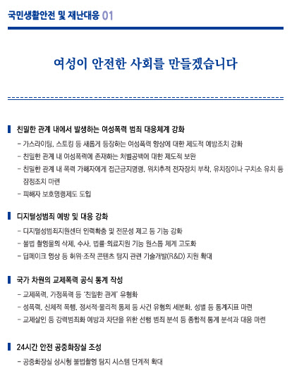 이런 통계 공백 상태의 교제폭력은 새 정부가 이에 대한 대응을 국정과제로 추진할 경우 동력을 얻을 것으로 전망된다. 앞서 이 대통령은 대선 공약집을 통해 △교제폭력·가정폭력 등 ‘친밀한 관계’ 유형화 △성폭력·신체적 폭행·정서적 혹은 물리적 통제 등 사건 유형 세분화 △성별 통계지표 마련 △선행범죄 분석 등을 제시했다. 아울러 ‘여성 정책 발표문’을 통해서는 “교제 폭력 범죄에 대한 처벌을 강화하고 반드시 피해자 보호명령이 적용되도록 개선하겠다”며 “가해자에게 접근 금지 명령, 불응 시 접근 금지 명령의 실효성 확보를 위한 유치장 유치 등의 강력한 대책을 마련할 것”이라고 밝히기도 했다.