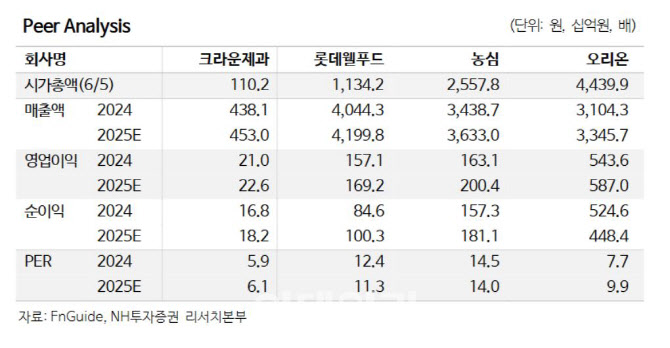 백 연구원은 “크라운제과 2025년 기준 주가수익비율(PER)은 6.1배로 업종 내 최저 수준이다”며 “다만 저평가 이유였던 성장성 및 매출 정체가 점차 해소될 수 있는 구간으로 판단한다”고 전했다.