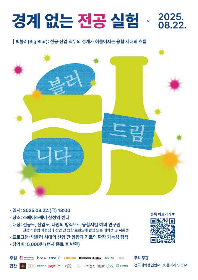 [이데일리 이선우 기자] ‘블러드림니다: 경계 없는 전공 실험’ 행사가 8월 22일 삼성동 스페이스쉐어 삼성역센터에서 열린다. 전국 대학생 연합 마이스 동아리 ‘쏨’(S.O.M.)이 산업 간 경계가 사라진 빅블러(Big Blur) 시대 융복합 산업 트렌드에 맞는 새로운 진로 설계 방법과 전략, 다양한 진로 선택의 가능성을 짚어보기 위해 마련한 행사다. 디지털 전환(DX), 산업 간 융복합으로 새롭게 등장한 직업과 직무, 바뀐 산업 현장에서 원하는 인재상 등을 알아보고, 전공의 경계를 초월한 진로 확장의 방법과 가능성을 타진해 볼 수 있는 기회다.