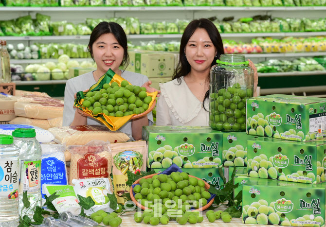 [이데일리 김태형 기자] 1일 서울 서초구 하나로마트 양재점에서 모델들이 올해 처음 출하된 매실을 선보이고 있다.
