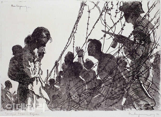 ‘조선 분단의 비극’(1962)은 소련에서 제작한 변월룡의 대표적인 판화로, 철조망을 사이에 둔 이산가족의 절절한 순간을 섬세하게 포착한 작품이다. 아이를 업은 아내는 눈물을 흘리고, 포로가 된 남편은 멀리서 그들을 안타깝게 바라본다. 변월룡이 존경했던 렘브란트의 판화와 견주어도 손색이 없을 만큼 인물의 감정과 순간의 비극을 탁월하게 표현해냈다. 조선 분단의 비극은 누구나 알고 있지만 그의 그림 앞에서는 그 익숙한 진실이 새삼 가슴에 사무친다. 이것이 바로 변월룡의 그림이 지닌 힘이다.