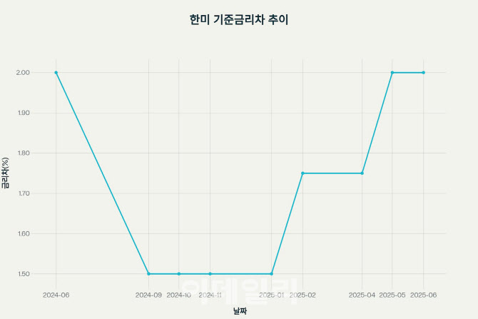 한미 금리차는 200bp(1bp=0.01%포인트)로 유지됐다. 한은은 지난해 10월 금리인하기를 시작한 이후 네 차례에 걸쳐 100bp를 인하하며 기준금리를 2.5%로 내렸다.