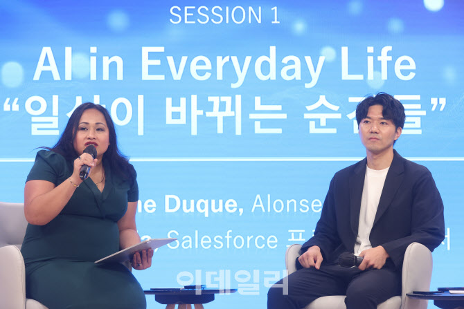 [이데일리 이영훈 기자] 크리스틴 듀크 알론세라 대표와 코헤이 후카다 세일즈포스 프로덕트 매니저가 20일 서울 중구 순화동 KG하모니홀에서 열린 ‘2025 AI 컨버전스 포럼’에서 '일상이 바뀌는 순간들' 주제로 대화를 하고 있다.
