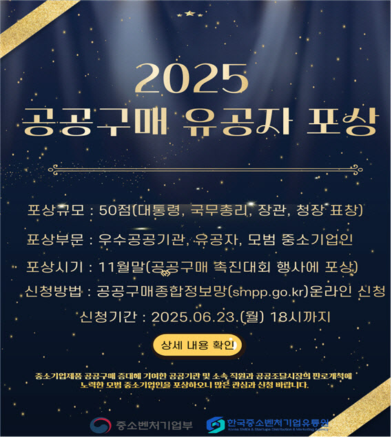 [이데일리 김영환 기자] 중소벤처기업부와 한국중소벤처기업유통원은 중소기업의 공공조달시장 진출과 공공구매 증대에 기여한 자를 포상하기 위해 ‘2025 공공구매 유공자 포상’ 후보자를 모집한다고 16일 밝혔다.
