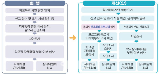 교육청 관계자는 “교육적 해결이 가능한 학폭이 많음에도 불구하고 형식적 절차가 반복되며 행정 비효율을 초래하고 있다”며 “교육 현장에서는 경미한 사안에 대해 관계 회복 프로그램을 통한 해결 확대의 필요성을 제기해왔다”고 제도 도입 취지를 밝혔다.