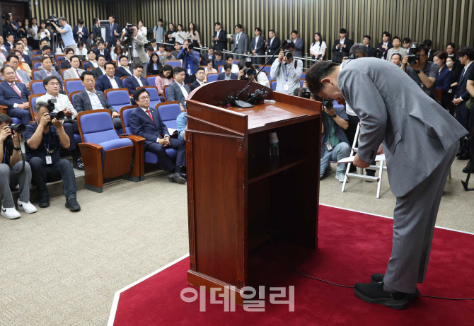 [이데일리 노진환 기자] 권성동 국민의힘 원내대표가 5일 오전 서울 여의도 국회에서 열린 의원총회에서 모두발언 후 허리숙여 인사하고 있다.