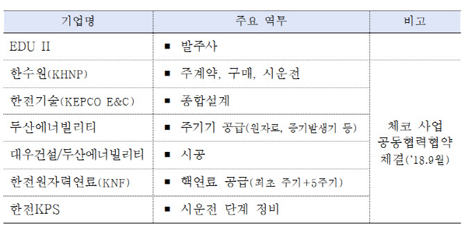 K원전산업 전반에 활력을 불어넣을 것으로 기대된다. 이 프로젝트에는 주계약자인 한수원 외에 다수의 기업이 ‘팀 코리아’로서 함께 한다. 한전기술(052690)이 설계를, 두산에너빌리티(034020)가 주기기 공급과 시공을 각각 맡는다. 대우건설(047040)이 건설사로 참여한다. 한전원자력연료는 핵연료 공급을, 한전KPS(051600)가 시운전과 정비를 맡는다. 그밖에 다수의 협력사가 이 사업을 위해 참여할 것으로 기대된다.