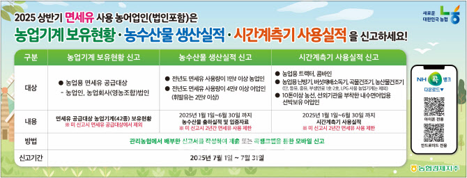 신고 대상자는 면세유 관리농협에 비치된 신고서를 작성한 후 농업기계 보유현황, 생산실적(1월 1일부터 6월 30일까지의 출하실적), 사용실적(농어업기계에 부착된 시간계측기 누계시간) 증빙서류를 첨부해 면세유 담당 직원에게 제출하면 된다. 방문신고가 어려운 경우‘NH콕뱅크’앱을 통한 모바일 신고도 가능하다.